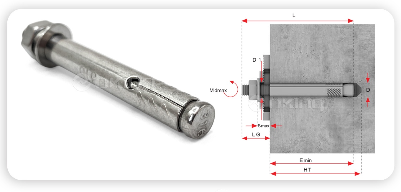 | Sukat ng Bolt | Sukat ng manggas | Drill Hole Diameter | Haba ng Drill | Min. Pag-embed | Max. Kapal ng kabit | Fixture Hole Diameter | Max. Torque | Haba ng Bolt |