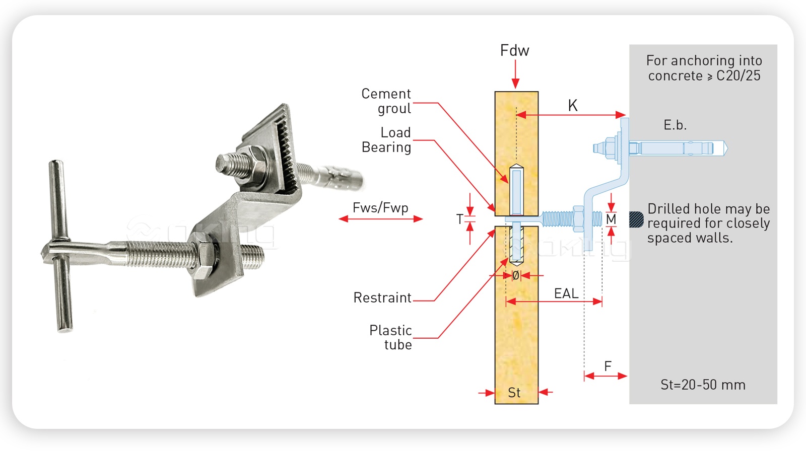 | K (mm) | K - (mm) | K (mm) | Fdw (n) | F (mm) | Fwp (n) | Fws (n) | E.B. (mm) | ф (mm) | M (mm) | T (mm) | Eal (mm) | |